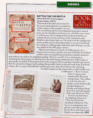Much more than just a book on Volkswagens, it's a human-interest story, and the account of the late Ivan Hirst and his team reviving Beetle production and the obstacles put in their way makes for gripping reading. There's a wealth of new information, including the fascinating revelations that, far from being uninterested in Volkswagen as previously recorded, Ford proposed that it be merged with its existing German operations. But the executive charged with making this possible bailed at the eleventh hour. Far from being a dry account of the Beetle's embryonic years, this effort follows the enduring Veedub's impact on the automotive world and the cars it influenced - Chevy Corvair, Hino Contessa and innumerable Renaults among them. The author reveals why the car's design wasn't intrinsically changed during its lifetime and brings things up to date with the launch of the new Beetle in 1998.