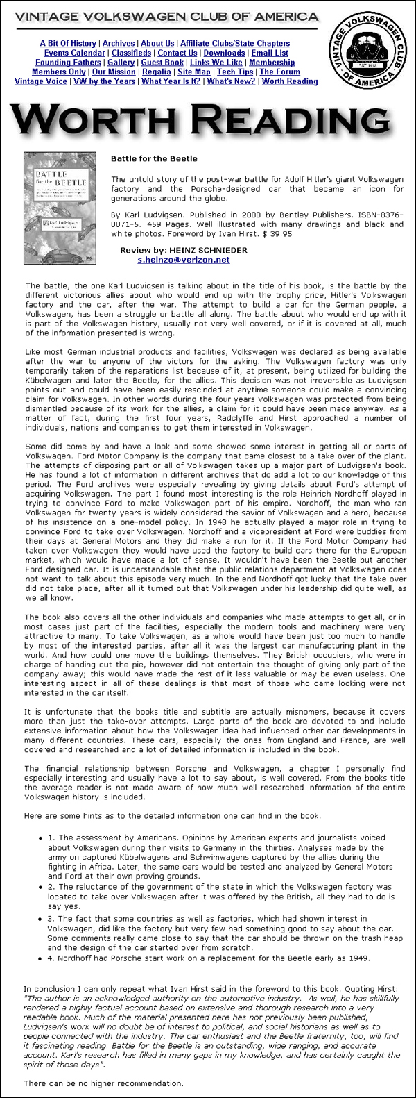 In conclusion I can only repeat what Ivan Hirst said in the foreword to this book. Quoting Hirst: "The author is an acknowledged authority on the automotive industry. As well, he has skillfully rendered a highly factual account based on extensive and thorough research into a very readable book. Much of the material presented here has not previously been published, Ludvigsen's work will no doubt be of interest to political, and social historians as well as to people connected with the industry. The car enthusiast and the Beetle fraternity, too, will find it fascinating reading. Battle for the Beetle is an outstanding, wide ranging, and accurate account. Karl's research has filted in many gaps in my knowledge, and has certainly caught the spirit of those days".